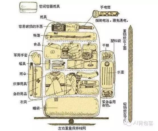 轻的装备放在下面,重的放在上面。因为任何人在走路时都会向前微倾,这样就把重量集中在你的臀部而不是你的肩膀上。在底部可以放你的睡袋。然后是当天你不用的衣服:内衣和袜子,鸭绒衣等。接着是你的睡垫,应该放在里面而不是绑在外面。然后是你的帐篷和防雨布。然后是野炊用品:炉子,油,壶子,杯子和匙子,滤水器和急救包。然后在靠近顶端的地方――你的食品,恶劣天气的衣服放在最上面,最后拉紧口袋绳子。